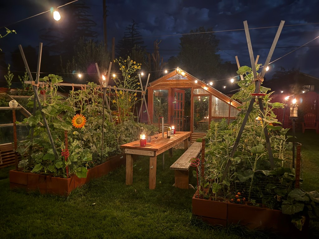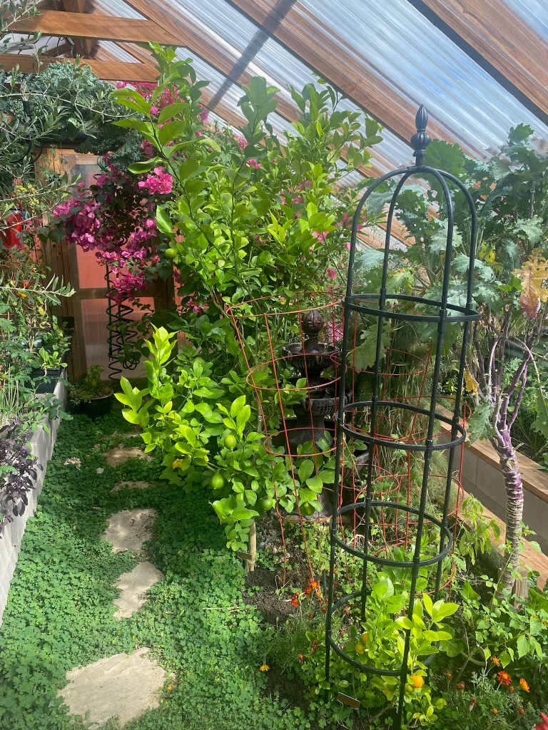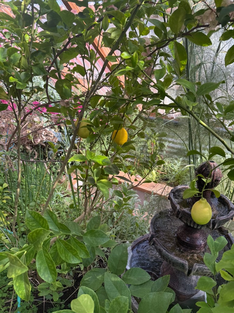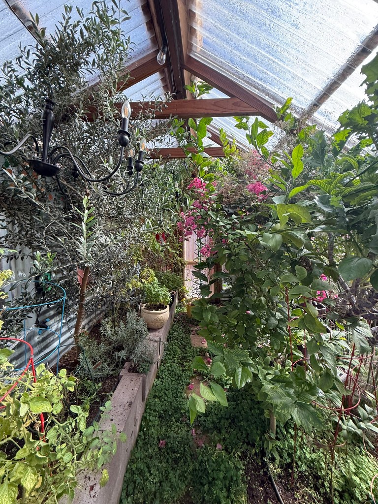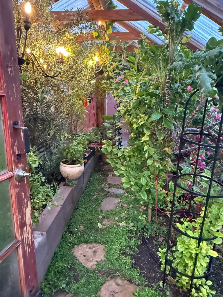 Inspired by the grand orangeries of European estate gardens and Versailles, it is built from reclaimed lumber and salvaged windows, made luxurious with chandeliers and a fountain. Citrus trees (meyer lemon, persian lime, calamondin), an olive tree, rosemary bushes, lavender, artichoke, kale trees, fennel and a 45-year old bougainvillea all grow here year-round, planted in the ground.