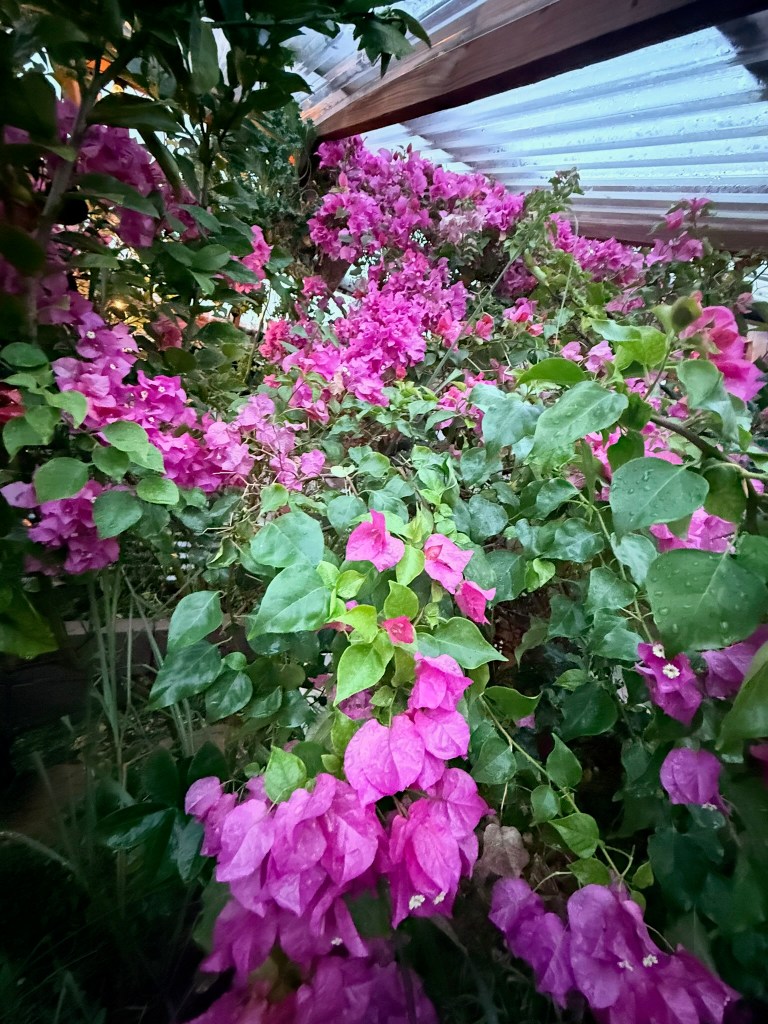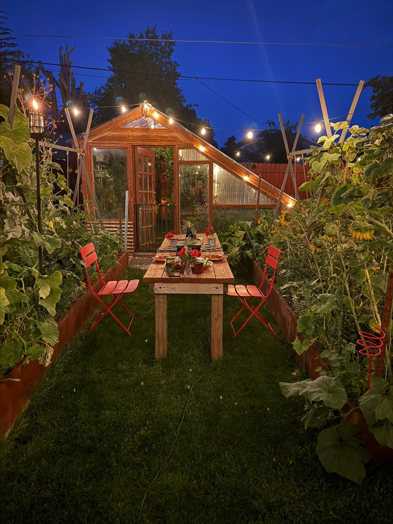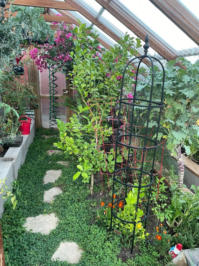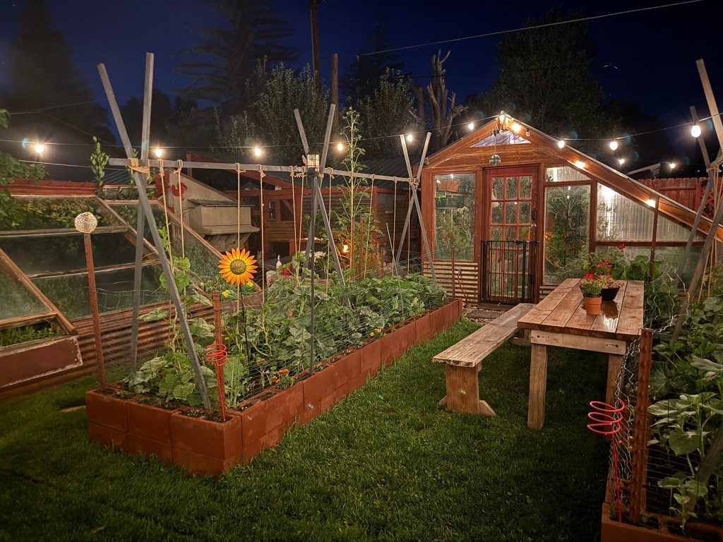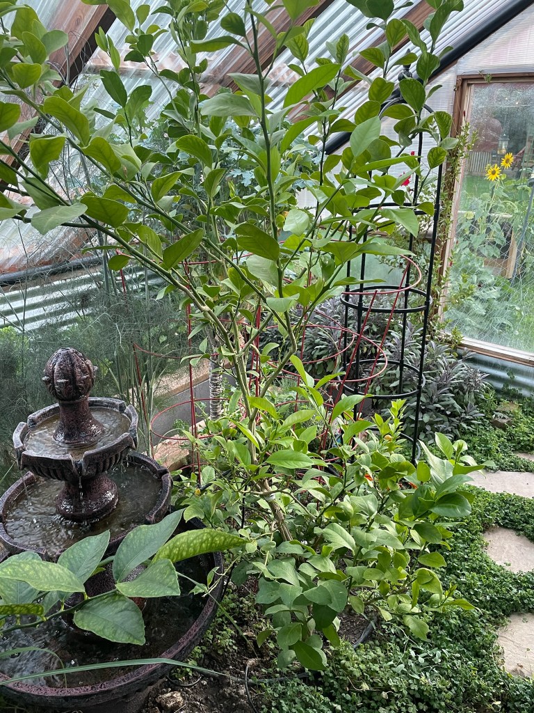 Inspired by the grand orangeries of European estate gardens and Versailles, it is built from reclaimed lumber and salvaged windows, made luxurious with chandeliers and a fountain. Citrus trees (meyer lemon, persian lime, calamondin), an olive tree, rosemary bushes, lavender, artichoke, kale trees, fennel and a 45-year old bougainvillea all grow here year-round, planted in the ground.