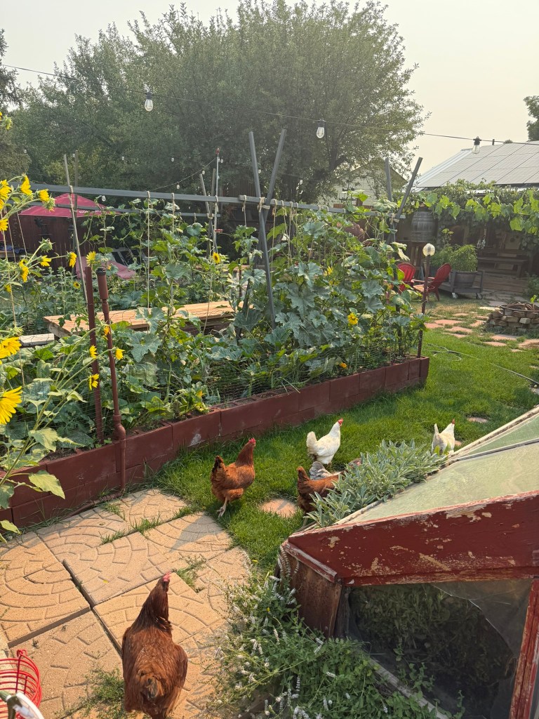Six troublemaking chickens earn their keep by providing eggs and compost.