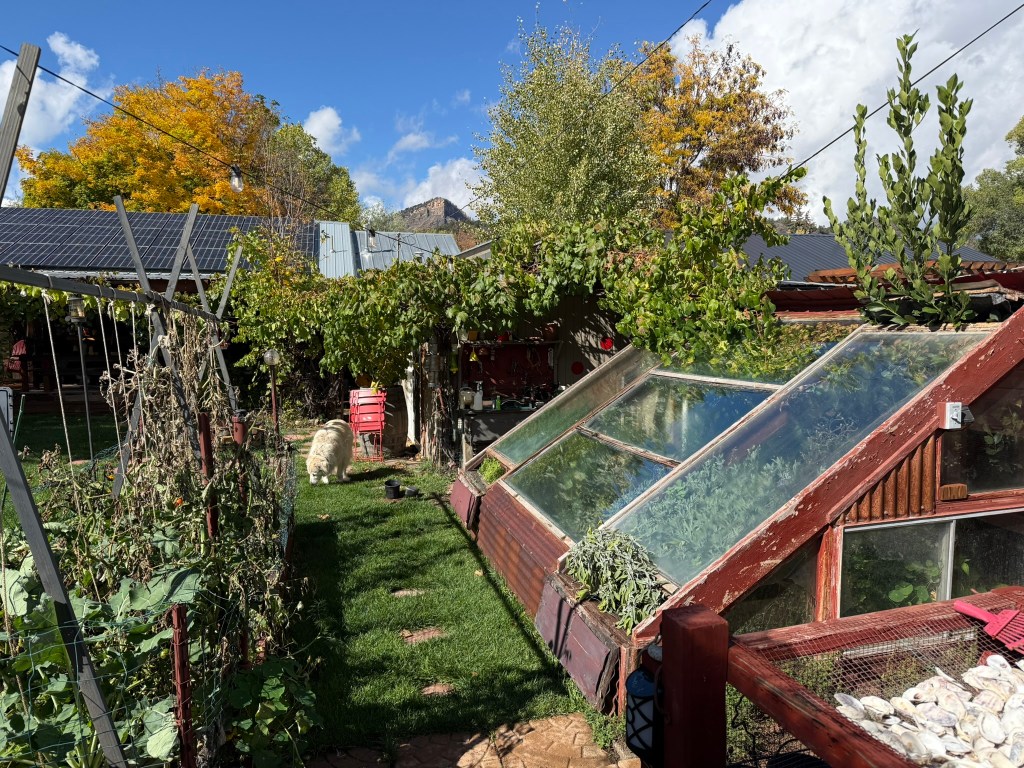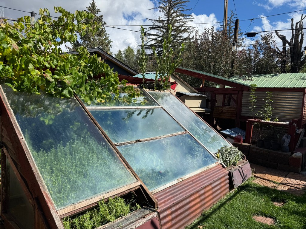 Built from salvaged roadside glass and reclaimed lumber, our OG greenhouse is a passive solar success story in action. South-facing, with a roof angle matched to the winter sun, thermal mass water barrels, a hand dug cold sink, no heating is required.